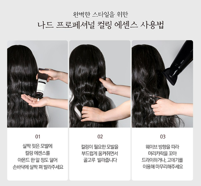 나드 프로페셔널 컬링 에센스와 스타일 볼륨 스프레이와 함게 사용하면 컬링 유지력도 높이고 집에서도 손쉽고 완벽하게 스타일링을 완성할 수 있어요.