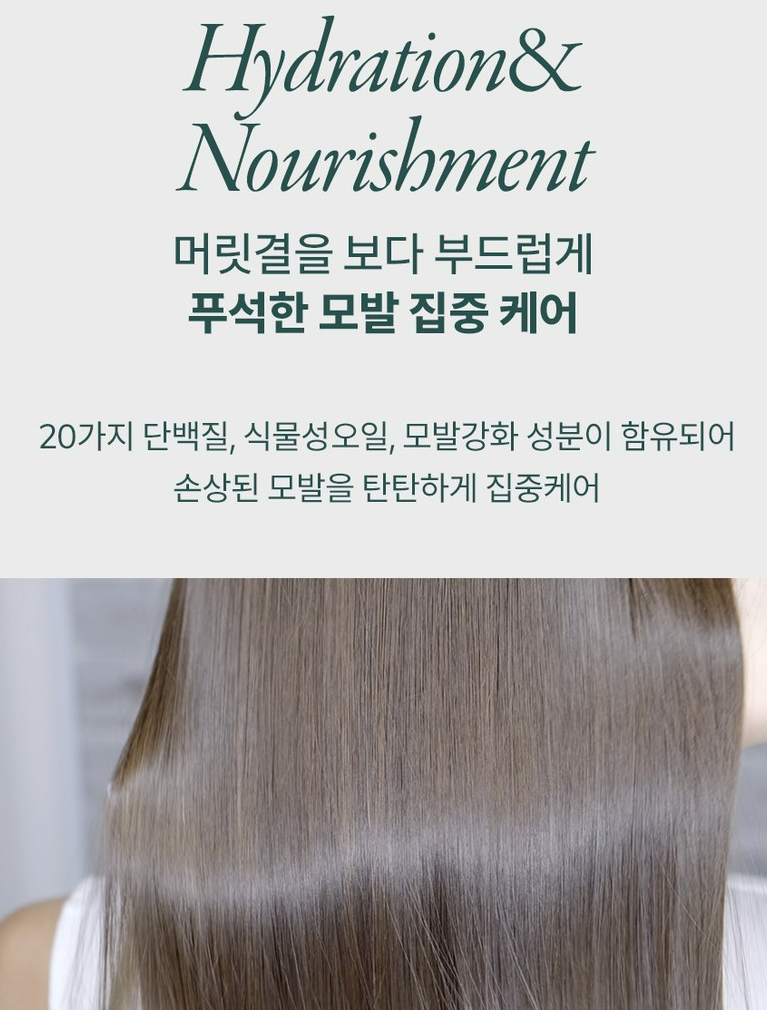 20가지 단백질, 식물성 오일, 모발 강화 성분이 함유되어 손상된 모발을 탄탄하게 집중케어 할 수 있어요.