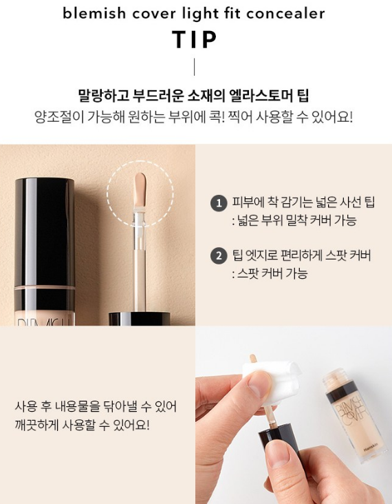 팁으로 컨실러를 사용하고 별도의 브러쉬 없이 팁을 닦아서 브러쉬 대신 사용할 수 있어요!