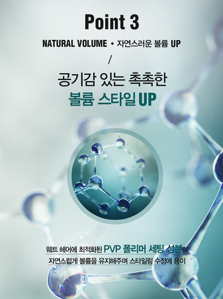 웨트 헤어에 최적화된 PVP 폴리머 세팅 성분이 자연스럽게 볼륨을 유지해주며 스타일링 수정에 용이해요.