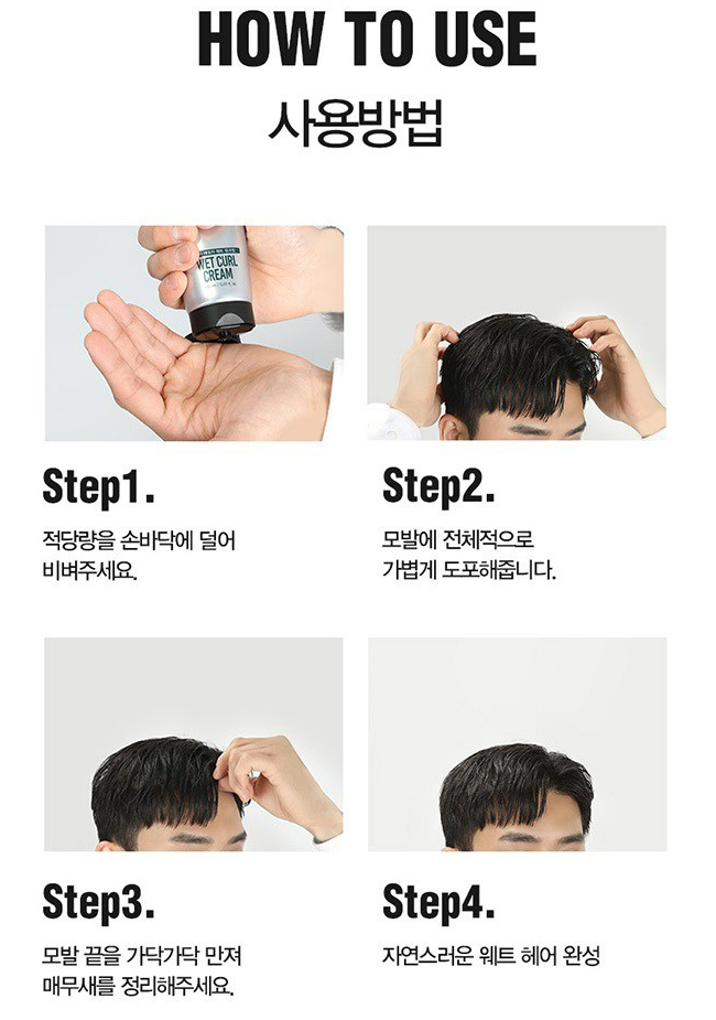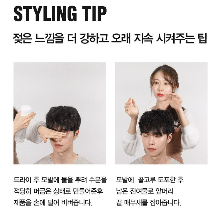 드라이 후 모발에 물을 뿌려 수분을 적당히 머금은 상태로 만들어준 후 제품을 손에 덜어 비벼주세요. 그 다음 모발에 골고루 도포한 후 남은 잔여물로 앞머리 끝 매무새를 잡아주시면 젖은 느낌을 더 강하고 오래 지속시킬 수 있어요.