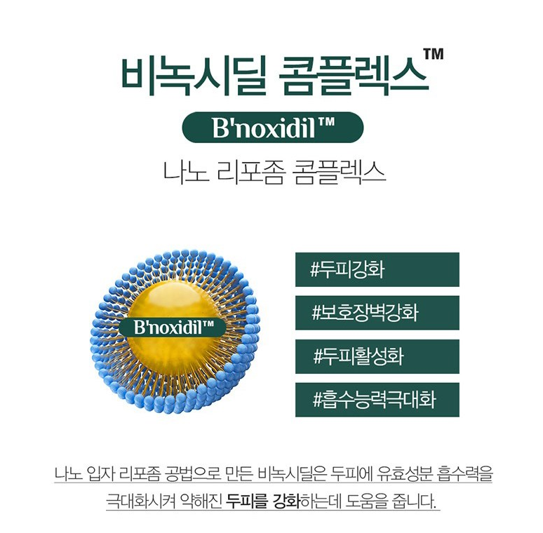 나노 입자 리포좀 공법으로 만든 비녹시딜은 두피에 유효 성분 흡수력을 극대화시켜 약해진 두피를 강화하는데 도움을 줘요.