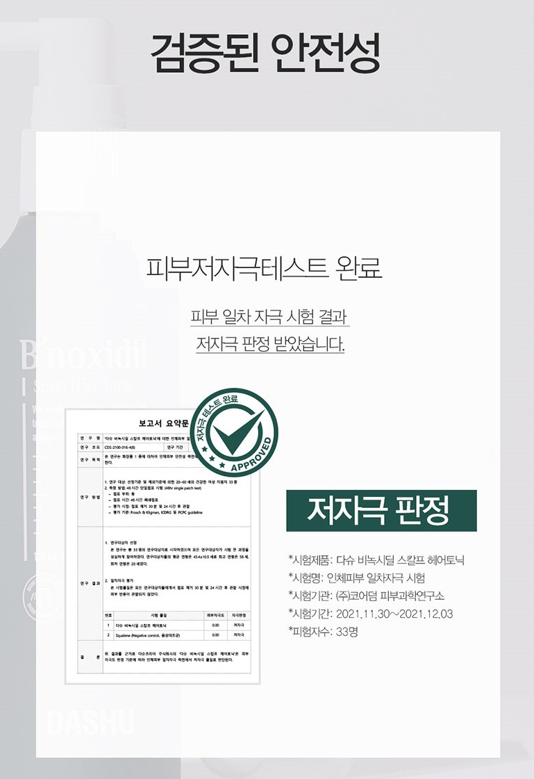 다슈 비녹시딜 스칼프 헤어 토닉은 불쾌한 냄새 완화에 효과적이라는 소취 테스트를 완료한 제품이에요.