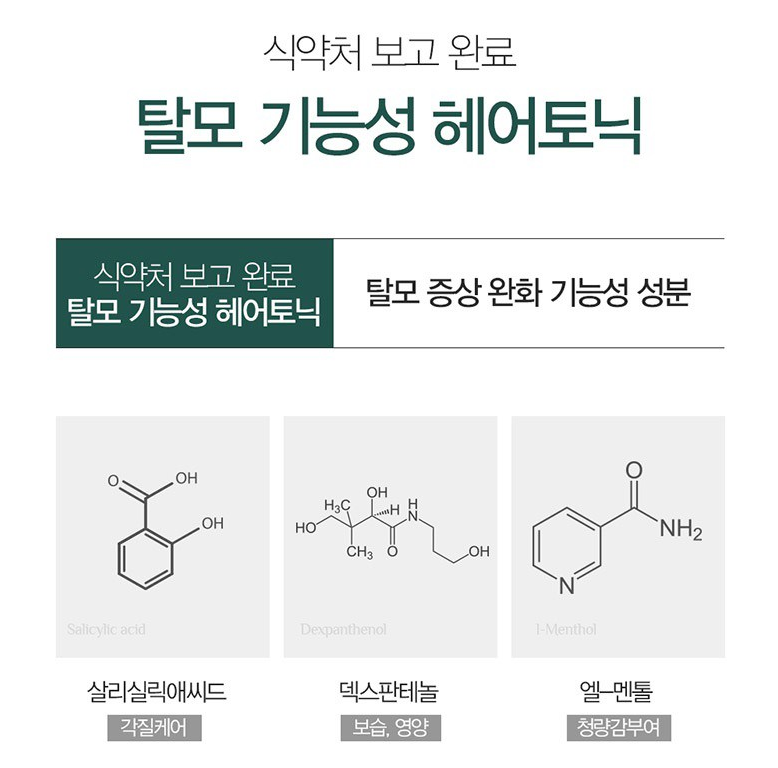 살리실릭애씨드, 덱스판테놀, 엘-멘톨 등 탈모 증상 완화 기능성 성분이 포함되어 있어요.