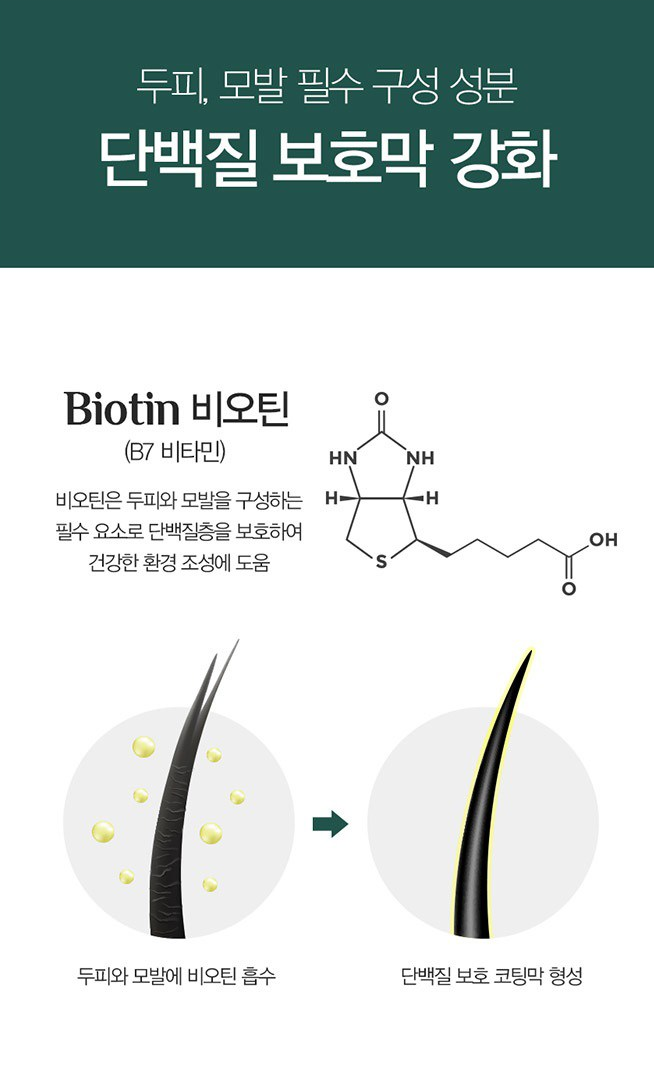 비오틴 성분이 함유되어 있어 두피와 모발을 구성하는 필수 요소로 단백질층을 보호하여 건강한 환경 조성에 도움을 줘요.