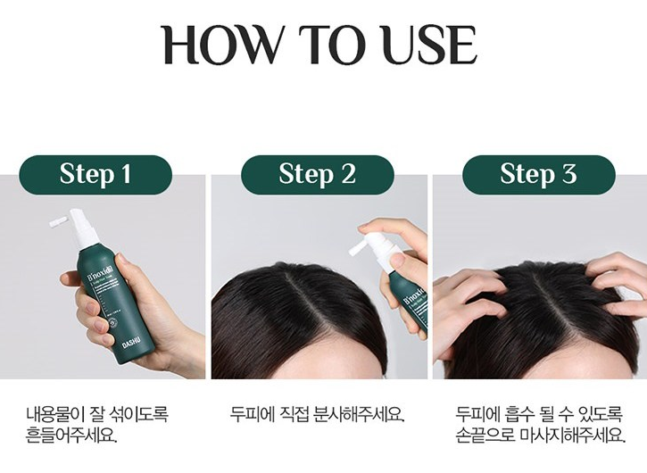 내용물이 잘 섞이도록 흔들어주세요. 그 다음 두피에 직접 분사해주세요. 마지막으로 두피에 흡수될 수 있도록 손끝으로 마사지해주시면 돼요.