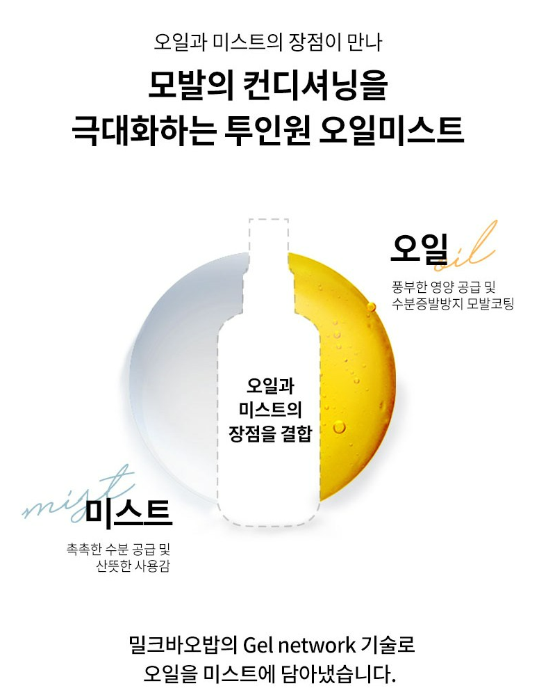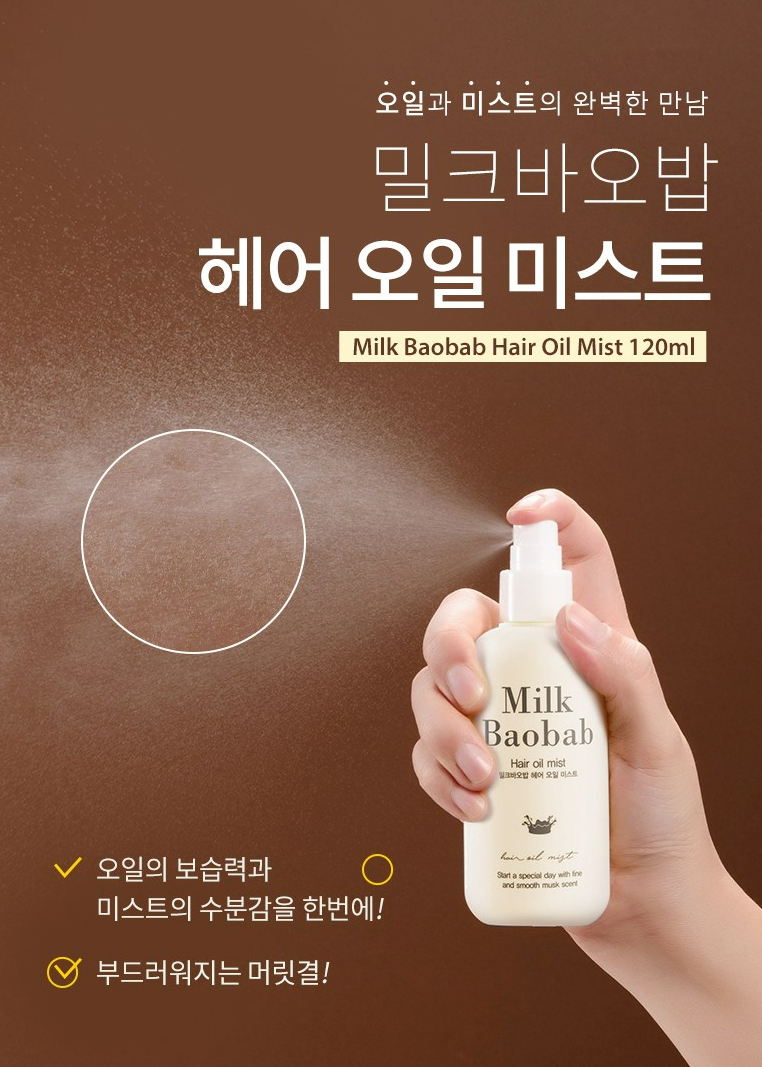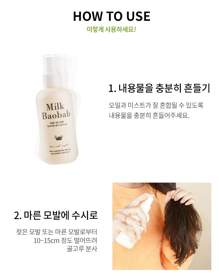 밀크바오밥 헤어 미스트는 촉촉한 수분 공급 및 산뜻한 사용감과 풍부한 영양 공급 및 수분증발방지 모발 코팅의 미스트와 오일의 2가지 장점을 모두 담아냈어요.