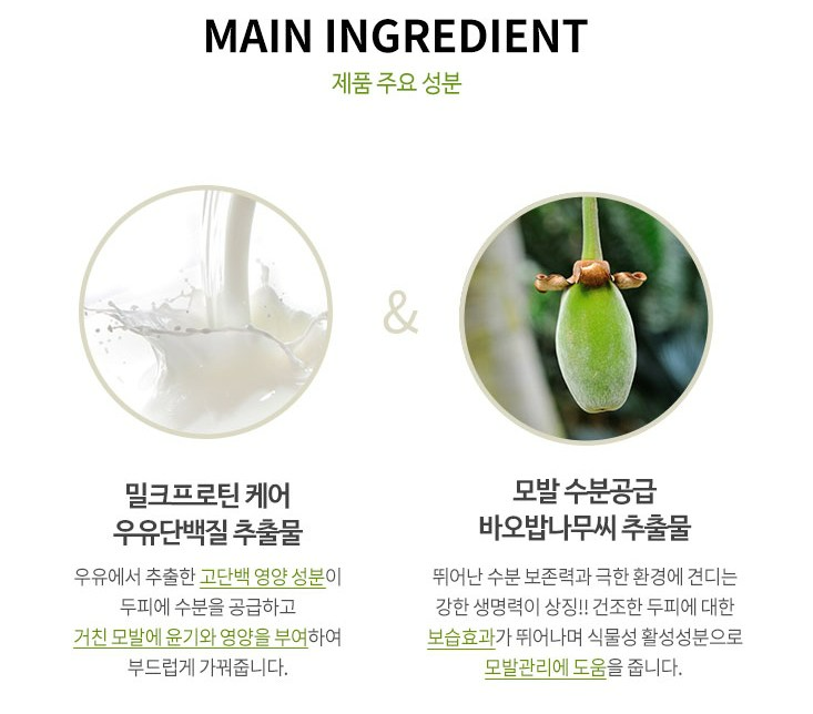 우유 단백질 추출물이 거친 모발에 윤기와 영양을 부여하고 바오밥나무씨 추출물이 건조한 두피를 보호하고 모발 관리에 도움을 줘요.