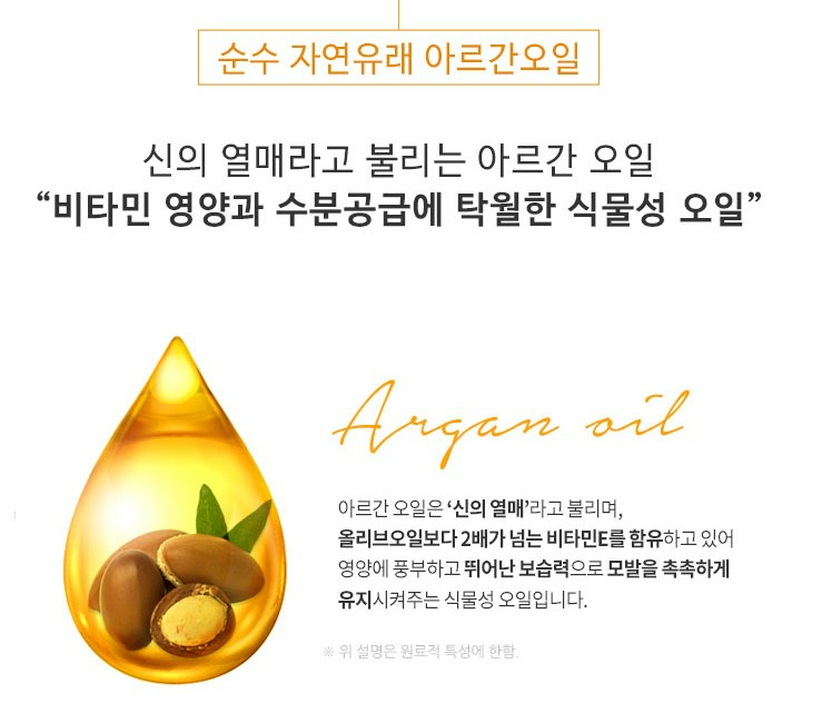 아르간 오일 함유되어 있어 아르간 오일의 비타민 E 성분이 모발 보습에 도움을 줘요.