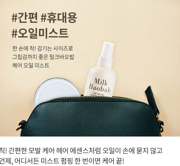 밀크바오밥 헤어 오일 미스트는 끈적이지 않는 산뜻한 마무리, 엉킨 머리 윤기 케어, 한 손에 쏙 들어오는 사이즈와 편리함이 가장 큰 특징이에요.