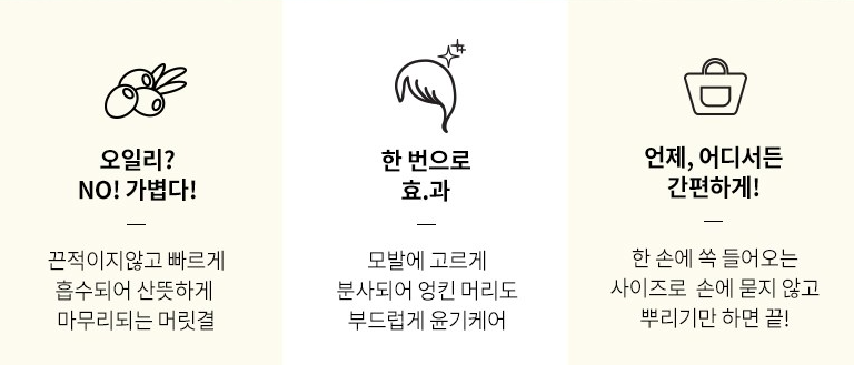 간편한 모발 케어 헤어 에센스 처럼 오일이 손에 묻지 않고 언제, 어디서든 미스트 펌핑으로 미스트 펌핑 한 번으로 간편하게 케어할 수 있어요.