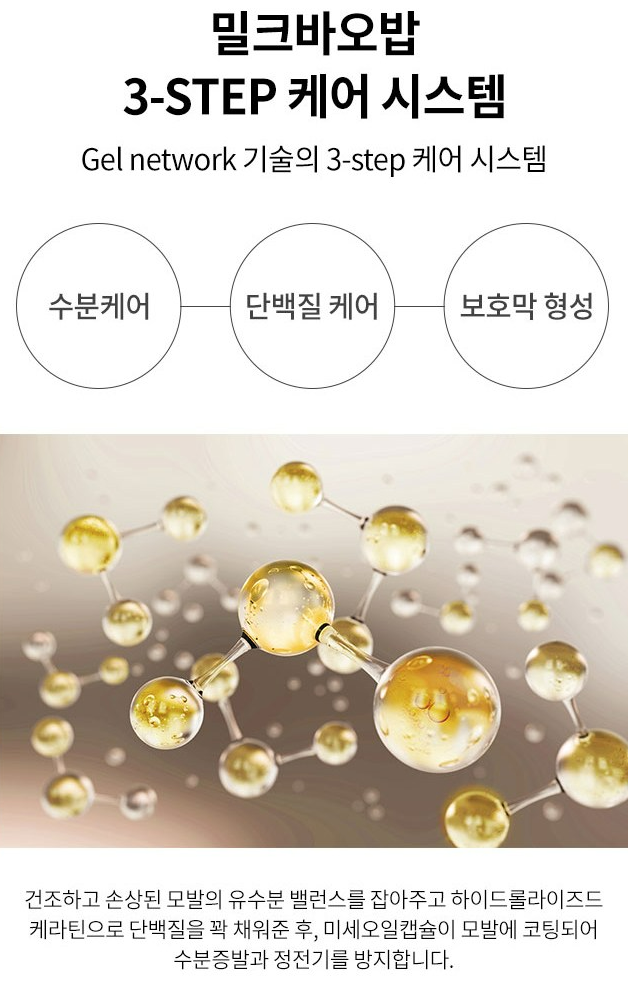 건조하고 손상된 모발의 유수분 밸런스를 잡아주고 하이드롤라이즈드 케라틴으로 단백질을 꽉 채워준 후, 미세 오일 캡슐이 모발에 코팅되어 수분 증발과 정전기를 방지해줘요.