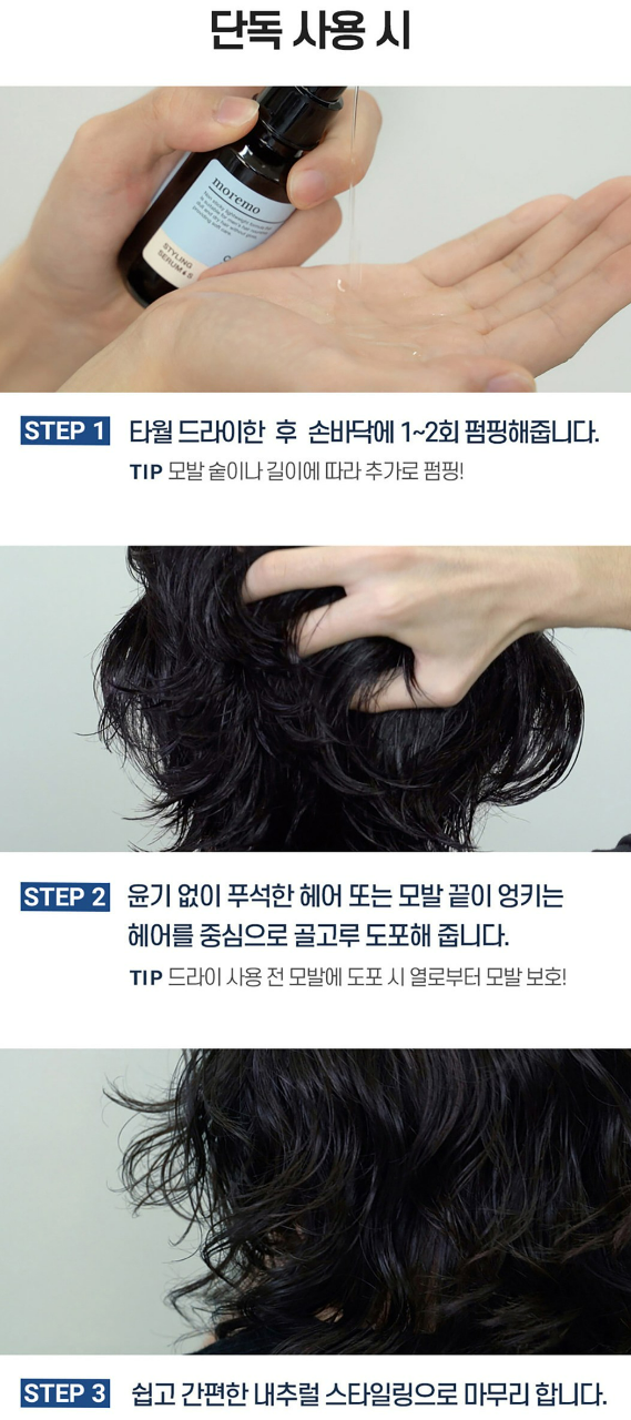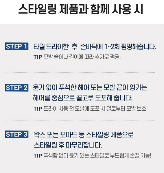 스타일링 제품과 함께 사용 시에는 타월 드라이 한 후 손바닥에 1~2뢰 펌핑해주세요. 윤기 없이 푸석한 헤어 또는 모발 끝이 엉키는 헤어를 중심으로 골고루 도포해주세요. 그 다음 왁스 또는 포마드 등 스타일링 제품으로 스타일링 후 마무리 해주세요.