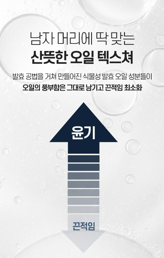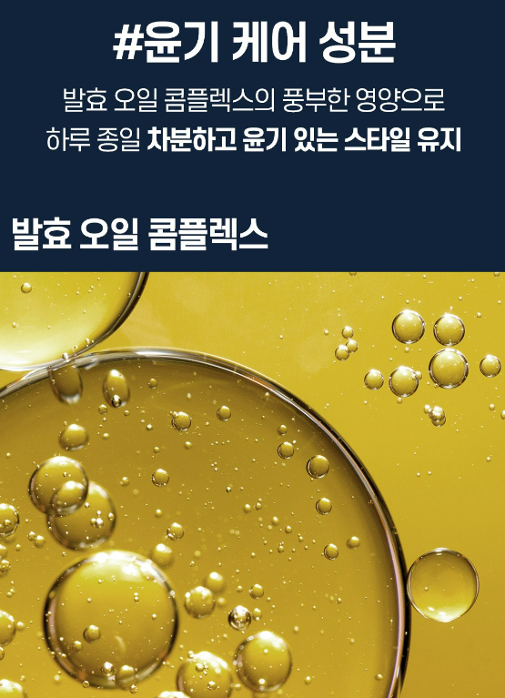 발효 공법을 거쳐 만들어진 식물성 발효 오일 성분들이 오일의 풍부함은 그대로 남기고 끈적임을 최소화 해줘요.