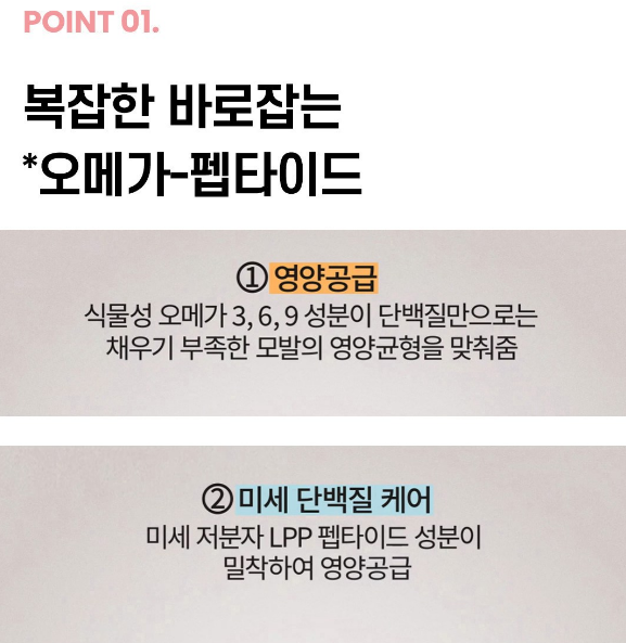 식물성 오메가 3, 6, 9 성분이 단백질만으로는 채우기 부족한 모발의 영양 균형을 맞춰줘요. 그리고 미세 저분자 LPP 펩타이드 성분이 밀착하여 영양을 공급해줘요.