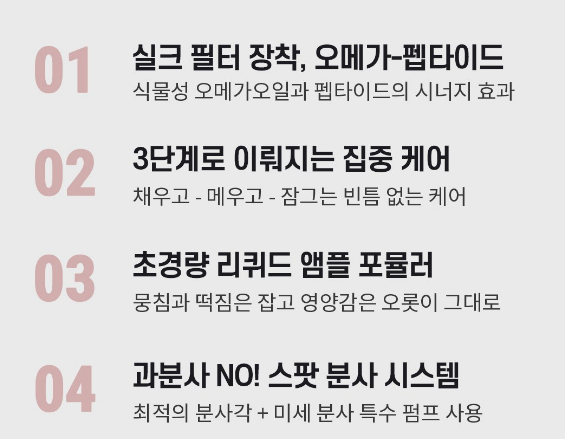 모레모 프로틴 미스트 팩은 식물성 오메가 오일과 펩타이드, 3단계 집중 케어, 초경량 리퀴드 앰플 포뮬러, 스팟 분사 시스템이 가장 큰 특징이에요.