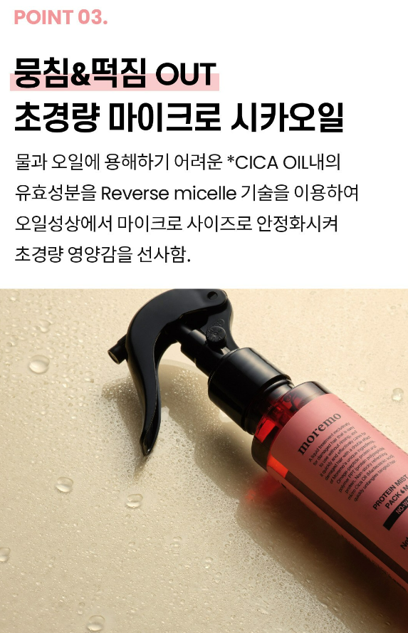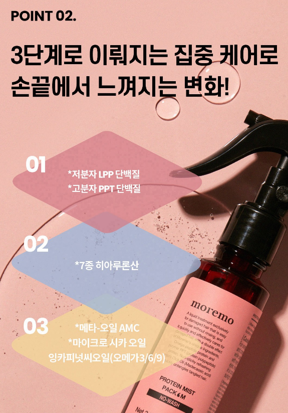 모레모 프로틴 미스트 팩은 식물성 오메가 오일과 펩타이드, 3단계 집중 케어, 초경량 리퀴드 앰플 포뮬러, 스팟 분사 시스템이 가장 큰 특징이에요.