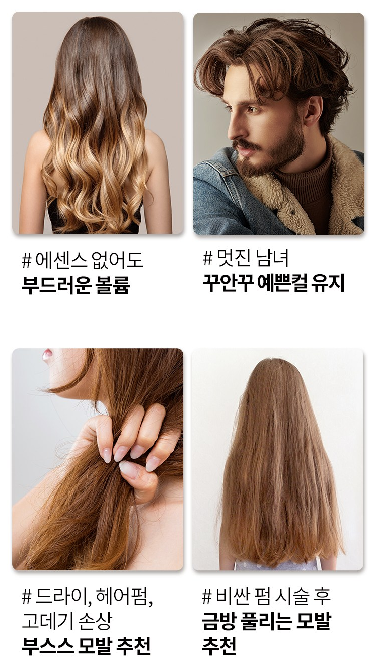 에센스 없이도 부드러운 볼륨을 만들어 낼 수 있고, 멋진 꾸안꾸 컬을 유지할 수 있어요. 드라이, 헤어펌, 고데기 손상 등 부스스 모발과 비싼 펌 시술 후 금방 풀리는 모발에 추천해요.