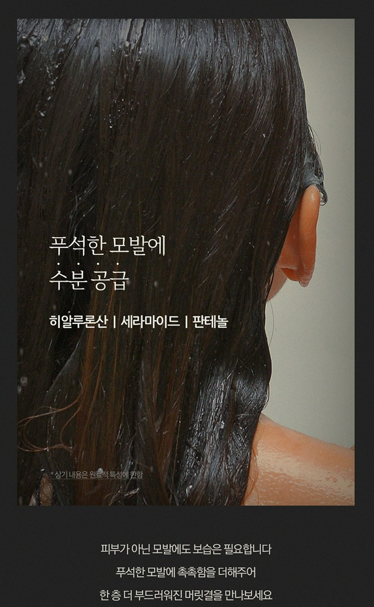 히알루론산, 세라마이드, 판테놀 성분이 푸석한 모발에 촉촉함을 더해주어 한 층 더 부드러워진 머릿결을 만나볼 수 있어요.