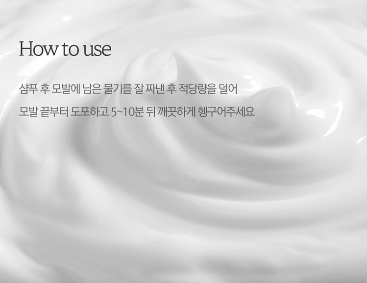 샴푸 후 모발에 남은 물기를 잘 짜낸 후 적당량을 덜어 모발 끝부터 도포하고 5~10분 뒤 깨끗하게 헹구어 주세요.