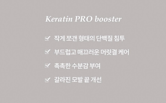 케라틴 프로 부스터가 작게 쪼갠 형태의 단백질 침투를 돕고 부드럽고 매끄럽게 머릿결을 케어해줘요. 또한, 촉촉한 수분감을 부여하고 갈라진 모발 끝 개선에도 효과를 보실 수 있어요.