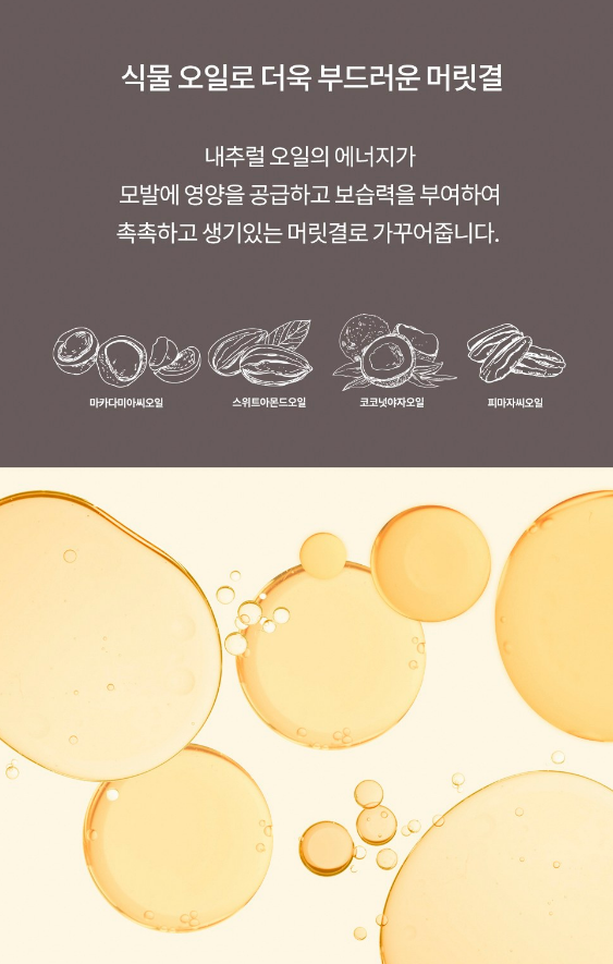 내추럴 오일의 에너지가 모발에 영양을 공급하고 보습력을 부여하여 촉촉하고 생기있는 머릿결을 가꾸어 줘요.