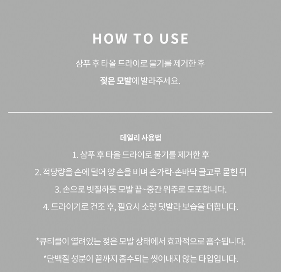 샴푸 후 타올 드라이로 물기를 제거한 후, 적당량을 손에 덜어 양 손을 비벼 손가락-손바닥에 골고루 묻힌 뒤 손으로 빗질하듯 모발 끝~중간 위주로 도포해주세요. 그 다음 드라이기로 건조 후, 필요시 소량 덧발라 보습을 더해주세요.