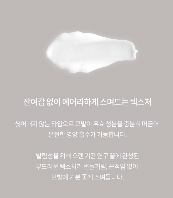씻어내지 않는 타입으로 모발이 유효 성분을 충분히 머금어 온전한 영양 흡수가 가능해요. 발림성을 위해 오랜 기간 연구 끝에 완성된 부드러운 텍스처가 번들거림, 끈적임 없이 모발에 기분 좋게 스며들어요.