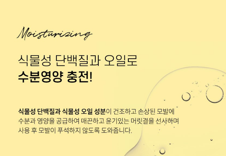 식물성 단백질과 식물성 오일 성분이 건조하고 손상된 모발에 수분과 영양을 공급하여 매끈하고 윤기있는 머릿결을 선사하며 사용 후 모발이 푸석하지 않도록 도와줘요.