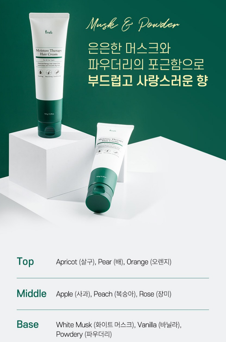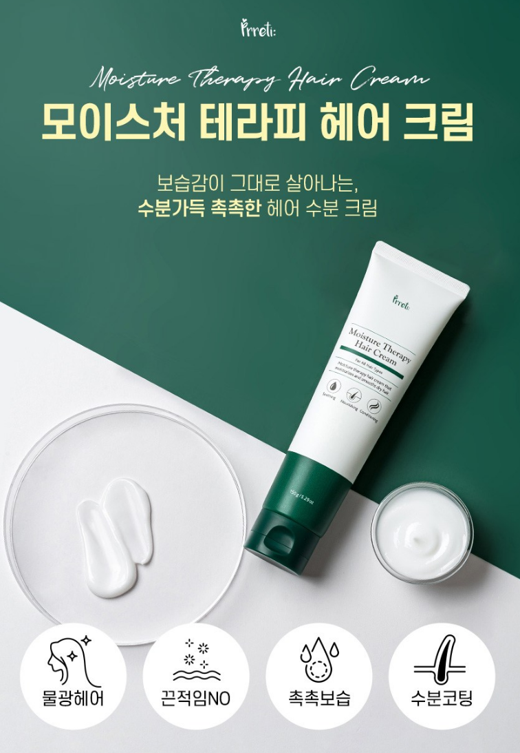 프레티 모이스처 테라피 헤어 크림은 물광 헤어, 끈적임 없는 텍스처, 촉촉 수분 보습 및 코팅이 가장 큰 특징이에요.