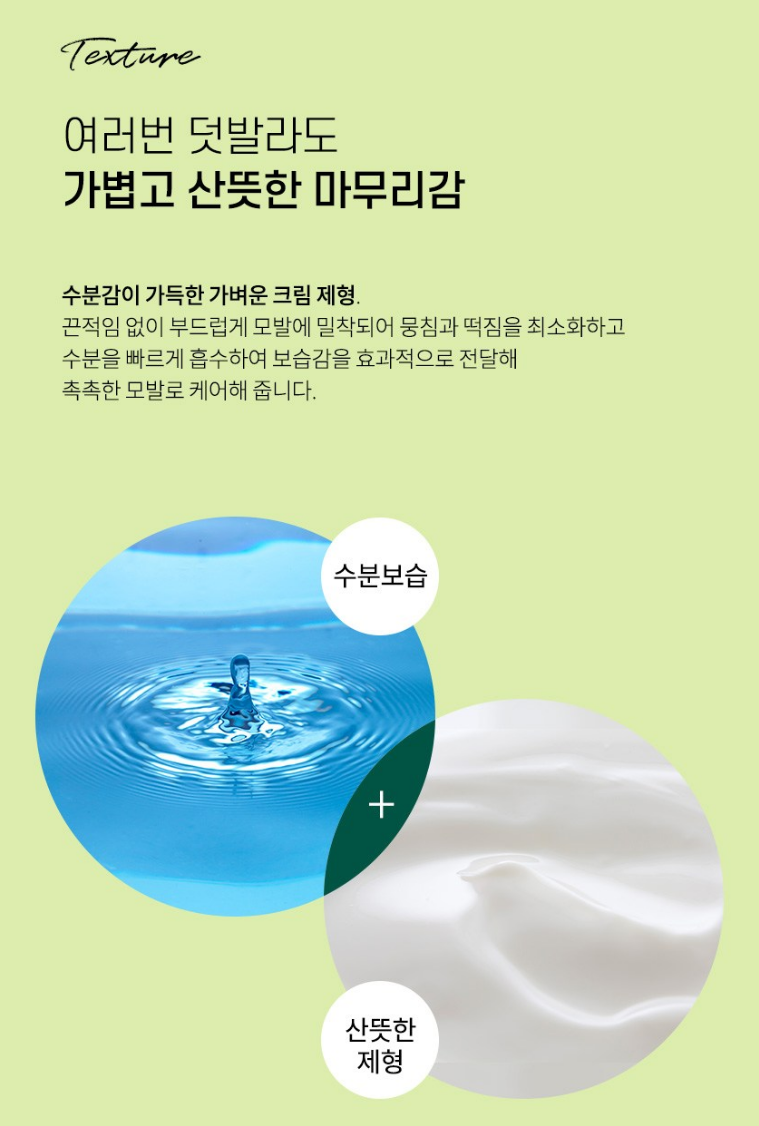 수분감이 가득한 가벼운 크림 제형으로 끈적임 없이 부드럽게 모발에 밀착되어 뭉침과 떡짐을 최소화하고 수분을 빠르게 흡수하여 보습감을 효과적으로 전달해 촉촉한 모발로 케어해줘요.