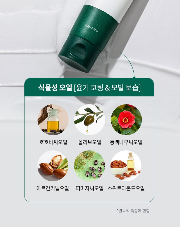 호호바씨 오일, 올리브 오일, 동백나무씨 오일, 아르간 커넬 오일, 피마자씨 오일, 스위트아몬드 오일 등 식물성 오일이 함유되어 있어 윤기 코팅과 모발 보습에 효과적이에요.