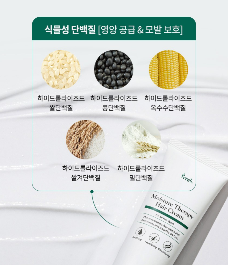 하이드롤라이즈드 쌀, 콩, 옥수수, 쌀겨, 밀 단백질 등 식물성 단백질 성분이 함유되어 있어 영양 공급 및 모발 보호에 효과적이에요.