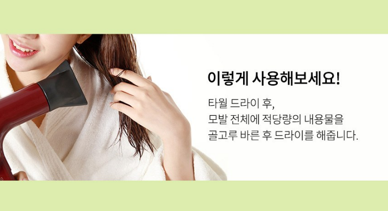 타월 드라이 후, 모발 전체에 적당량의 내용물을 골고루 바른 후 드라이를 해주세요.
