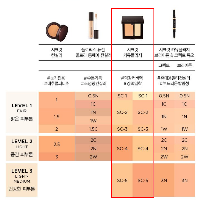 밝은 피부톤의 경우 SC1, SC2, SC3호를 사용하시면 되고, 중간 피부톤일 경우 SC4호, 건강한 피부톤일 경우 SC5호를 사용하시면 될 것 같아요!