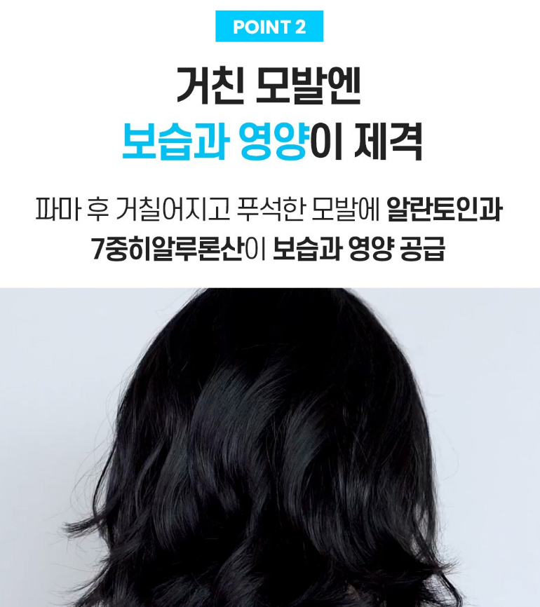 파마 후 거칠어지고 푸석한 모발에 알란토인과 7중 히알루론산이 보습과 영양을 공급해줘요.