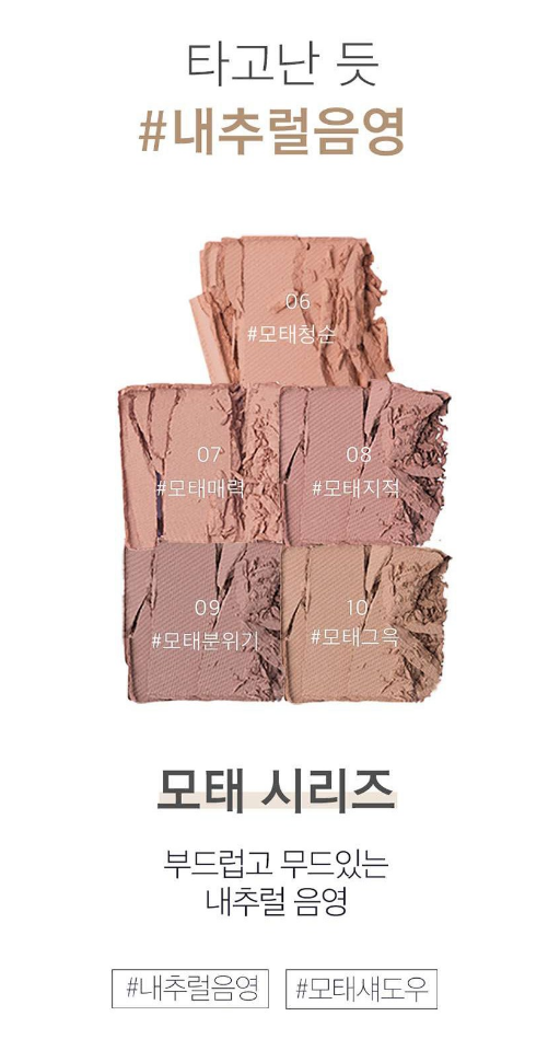 모태 시리즈는 살구 베이지 컬러의 모태 청순, 핑크 베이지 컬러의 모태 매력, 로즈 브라운 컬러의 모태 지적, 모브 브라운 컬러의 모태 분위기, 뉴트럴 브라운 컬러의 모태 그윽 총 5가지로 구성되어 있어요.