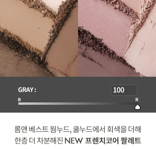 롬앤 베스트 웜 누드, 쿨 누드에서 회색을 더해 한층 더 차분해진 새로운 프렌치코어의 팔레트가 출시되었어요.
