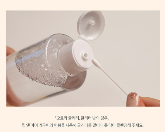 오로라 글리터, 글리터 밤의 경우, 립 앤 아이 리무버와 면봉을 사용해 글리터를 밀어내 듯 닦아 클렌징 해주세요.
