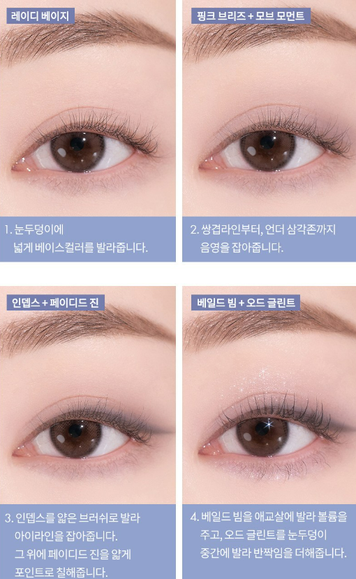 먼저 레이디 베이지 컬러를 베이스로 발라주세요. 그 다음 핑크 브리즈와 모브 모먼트 컬러를 쌍겹라인과 언더 삼각존에 발라 음영을 잡아주세요. 그 다음 인뎁스와 페이디드 진으로 아이라인을 잡아주고 베일드 빔은 애교살, 오드 글린트는 눈두덩이 중간에 발라 반짝임을 더해주세요.