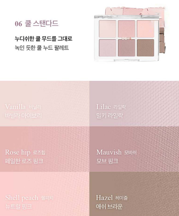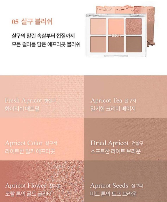 컬러는 총 8가지로 구성되어 있는데요. 바셀린 광 글리터의 누드 블러쉬, 음영 매트의 무드 블러쉬, 차분한 로지 브라운의 드라이 플라워, 더스티 로즈 컬러의 빈티지 플라워, 말린 살구 컬러의 살구 블러쉬, 누디쉬한 쿨 무드의 쿨 스탠다드 총 6가지와 이번에 새롭게 두가지 컬러가 또 추가되었어요. 소프트하고 뮤트한 무드의 웜 베이지와 페일하고 딥한 미드톤 무드의 쿨 그레이가 새롭게 추가된 색상이에요.
