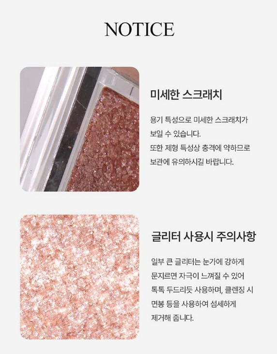 용기 특성으로 미세한 스크레치가 보일 수 있어요. 또한 제형 특성상 충격에 약하므로 보관에 유의해주세요. 일부 큰 글리터는 눈가에 강하게 문지르면 자극이 느껴질 수 있어 톡톡 두드리듯 사용하며, 클렌징 시 면봉 등을 사용하여 섬세하게 제거해주세요.
