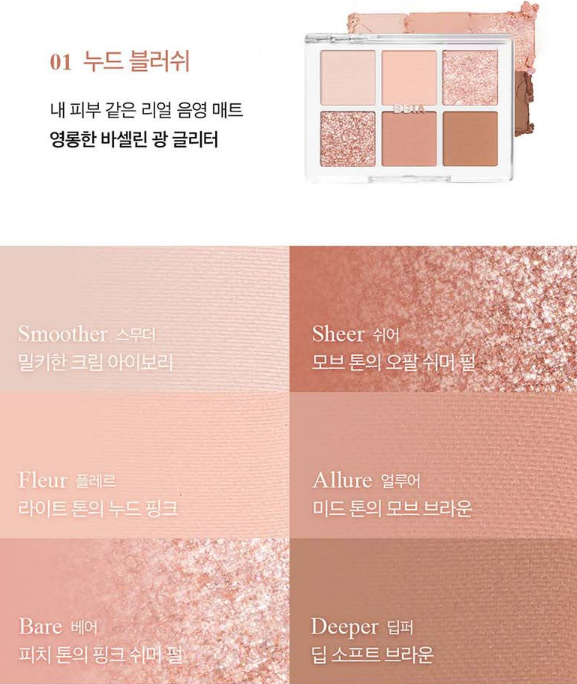 컬러는 총 8가지로 구성되어 있는데요. 바셀린 광 글리터의 누드 블러쉬, 음영 매트의 무드 블러쉬, 차분한 로지 브라운의 드라이 플라워, 더스티 로즈 컬러의 빈티지 플라워, 말린 살구 컬러의 살구 블러쉬, 누디쉬한 쿨 무드의 쿨 스탠다드 총 6가지와 이번에 새롭게 두가지 컬러가 또 추가되었어요. 소프트하고 뮤트한 무드의 웜 베이지와 페일하고 딥한 미드톤 무드의 쿨 그레이가 새롭게 추가된 색상이에요.
