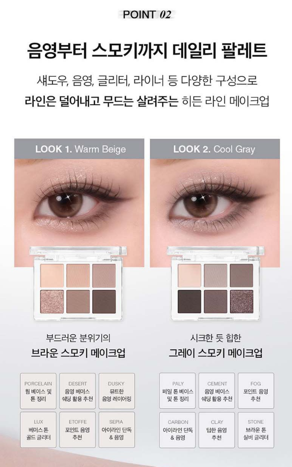 섀도우, 음영, 글리터, 라이너 등 다양한 구성으로 라인은 덜어내고 무드는 살려주는 히든 라인 메이크업이 가능해요.