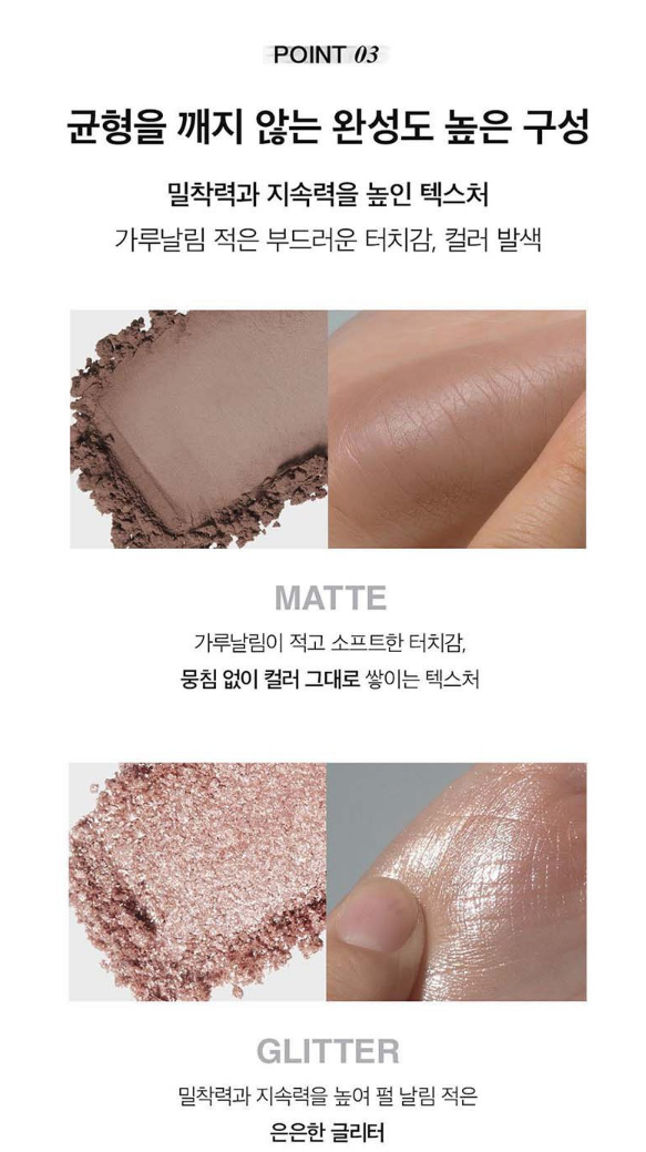 매트 제형은 가루 날림이 적고 소프트한 터치감을 가지고 있으며 뭉침 없이 컬러 그대로 쌓이는 텍스처를 가지고 있어요. 글리터의 경우 밀착력과 지속력을 높여 펄 날림을 줄였어요.
