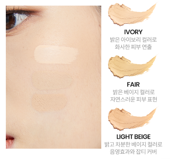 컬러는 세 가지 IVORY, FAIR, LIGHT BEIGE로 구성되어 있는데요. IVORY는 밝은 아이보리 컬러로 화사한 피부 연출을 돕고, FAIR는 밝은 베이지 컬러로 자연스러운 피부 표현을, LIGHT BEIGE는 밝고 차분한 베이지 컬러로 음영효과와 잡티 커버를 돕는답니다.