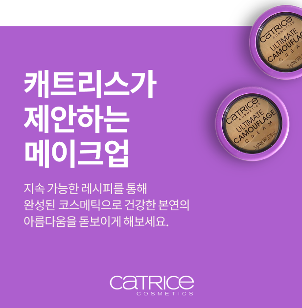 캐트리스는 지속 가능한 레시피를 통해 완성된 코스메틱으로 건강한 본연의 아름다움을 돋보이게 해보시길 권하고 있어요.