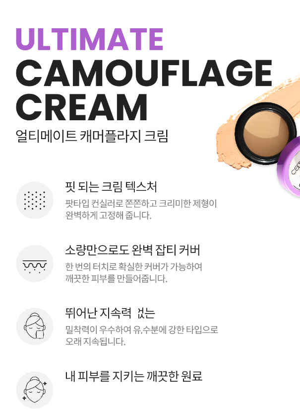 얼티메이트 캐머플라지 크림 컨실러는 팟타입 컨실러로 쫀쫀하고 크리미한 제형이 완벽하게 고정해주며, 소량만으로도 확실한 커버가 가능하고 깨끗한 피부를 만들어줘요. 또 밀착력이 우수하여 유, 수분에 강해 오래 지속되고, 내 피부를 지키는 깨끗한 원료가 사용되었다요!