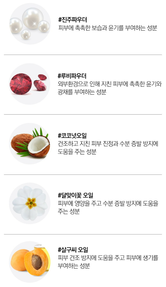 진주 파우더, 루비 파우더, 코코넛 오일, 달맞이꽃 오일, 살구씨 오일이 함유되어 눈가 피부를 촉촉하게 해주고 윤기와 광택을 만들어줘요.
