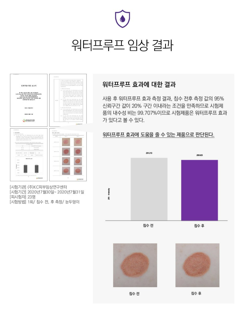 워터프루프 임상 시험 결과 제품 내수성 비가 99.707%로 워터프루프 효과에 도움을 줄 수 있는 제품이에요.
